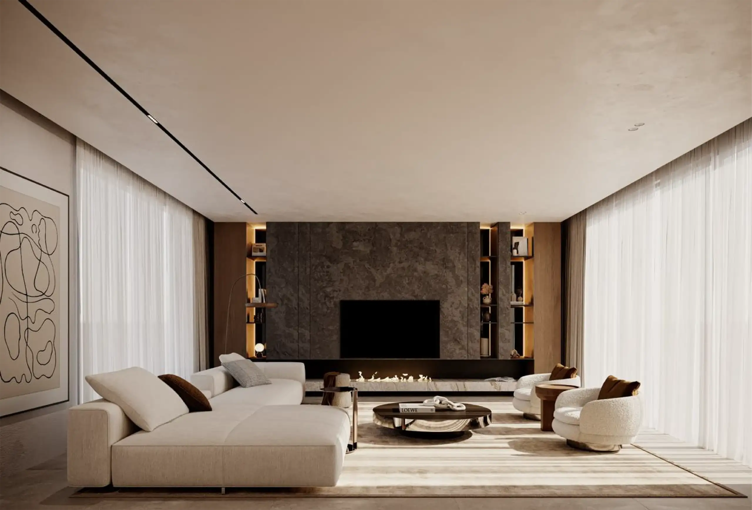 - Finitions : Sols et terrasses en carreaux 100×100 ou marbre, SDB en 60×120 ou marbre, plafonds blancs, faux-plafonds staff avec intégration CVC & éclairage.